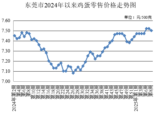 第8周,所監(jiān)測的雞蛋農(nóng)貿市場零售均價為每500克7.50元,較上周下降0.27%。
